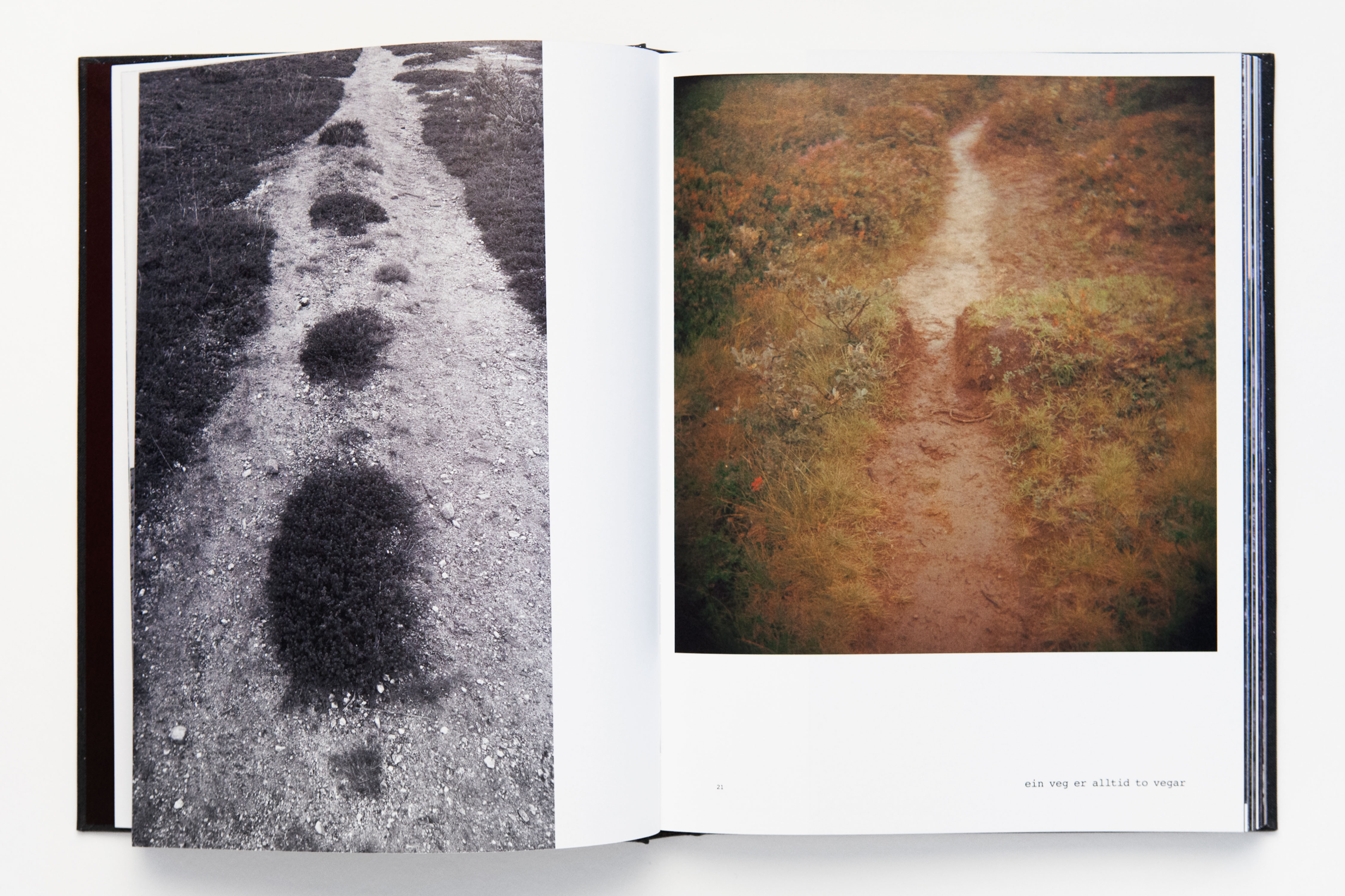 The book is comprised of original photographs mixed with historical photos and found materials. This compendium was created while surveying the development of a section of the E6, the main north-south thoroughfare in Norway, at the invitation of the Norwegian Public Roads Administration. Bergman’s approach stems in part from a strong distrust of the preconditions for modern road construction — particularly that speed and acceleration should constitute the very premise for all societal development — and her credo: technology that destroys is not fundamentally different from that used for repair. Illustrating these ideas against the system of rules, planning, and structures made for the road, the book becomes an alternative travel guide for intuitive and free thought.